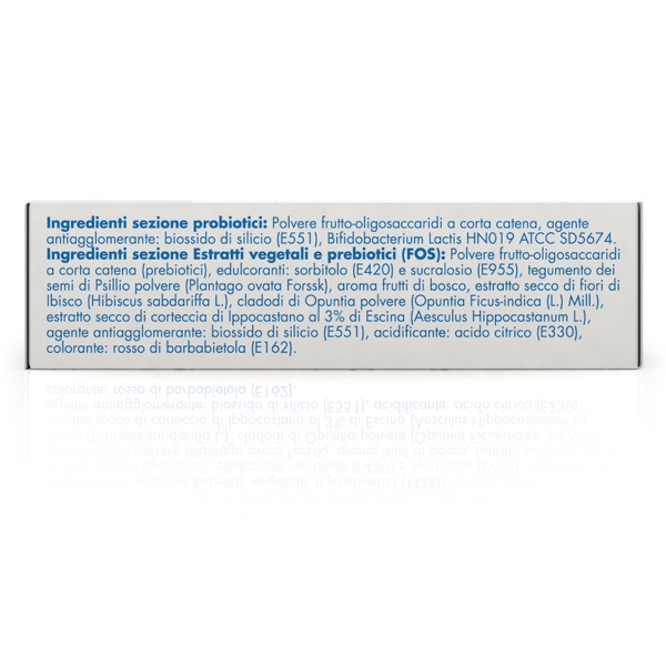 Sezione estratti vegetali e prebiotici (FOS): Polvere frutto-oligosaccaridi a corta catena (prebiotici), edulcoranti: sorbitolo e sucralosio, Psillio (Plantago ovata forsk.) cuticola polvere, aroma frutti di bosco, Ibisco (Hibiscus sabdariffa L., maltodestrina, idrossido di magnesio, biossido di silicio) fiori estratto secco, Opuntia (Opuntia Ficus-indica Mill.) foglie polvere, Ippocastano (Aesculus Hippocastanum L., maltodestrina) corteccia estratto secco, agente antiagglomerante: biossido di silicio, acidificante: acido citrico, colorante: barbabietola.