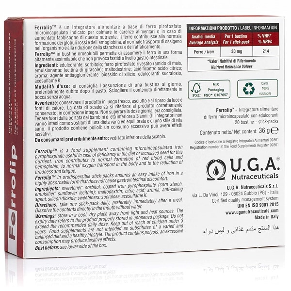 Una buona soluzione per colmare la carenza di ferro o in caso di aumentato fabbisogno di questo nutriente è l’assunzione di un integratore alimentare. Il gusto metallico tipico di questo genere di integratori spesso ne scoraggia l’assunzione, ma nel caso di Ferrolip questa problematica è stata risolta. Infatti, l’integratore U.G.A. Nutraceuticals vanta un sapore gradevole grazie all’aroma di limone, all’acido citrico e all’innovativa formulazione.