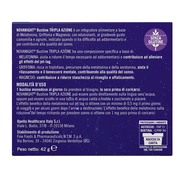 Novanight® Bustine è un integratore alimentare indicato per gli adulti che, grazie alla sua tripla azione, aiuta a ridurre il tempo necessario ad addormentarsi, aiuta il rilassamento ed il benessere mentale, contribuendo alla qualità del sonno e contribuisce a ridurre stanchezza al risveglio.